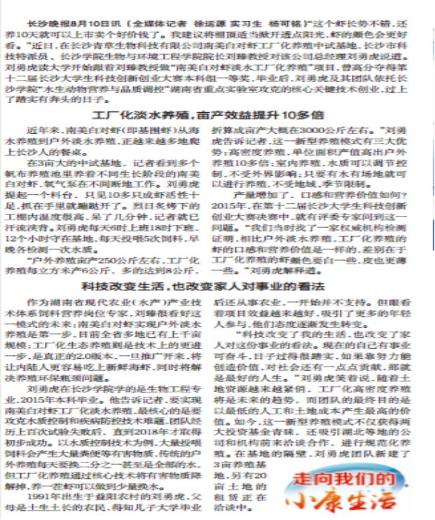 长沙晚报8月10日讯(全媒体记者 徐运源 实习生 杨可铭)“这个虾长势不错,还养10天就可以上市卖个好价钱了。我建议将棚顶适当掀开透点阳光,虾的颜色会更好看。”近日,在长沙青草生物科技有限公司南美白对虾工厂化养殖中试基地,长沙市科技特派员、长沙学院生物与环境工程学院院长刘臻教授对该公司总经理刘勇虎说道。刘勇虎读大学开始跟着刘臻教授做“南美白对虾淡水工厂化养殖”项目,曾高分夺得第十二届长沙大学生科技创新创业大赛本科组一等奖,毕业后,刘勇虎及其团队依托长沙学院“水生动物营养与品质调控”湖南省重点实验室攻克的核心关键技术创业,过上了踏实有奔头的日子。