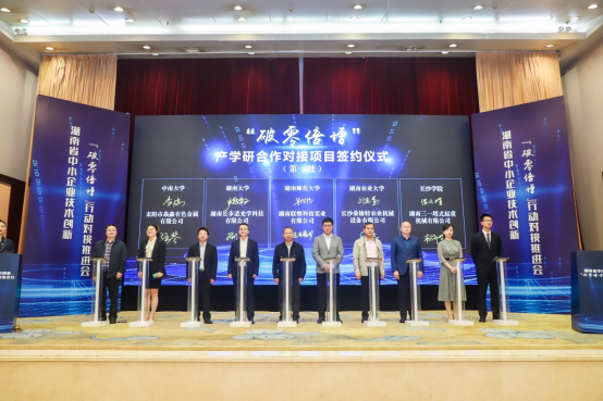 4月30日,由湖南省工信厅主办的湖南省中小企业技术创新“破零倍增”对接推进会在湖南宾馆圆满举行。高校与企业共有10项单笔签约金额500万以上的产学研合作项目进行现场签约,其中我校有2项,即张文娟博士团队与湖南三一塔式起重机械有限公司签订的《新型塔式起重机用电机及驱动控制系统研制》项目、杜甫佑教授团队与湖南欧亚药业有限公司签订的《抗肿瘤药物原料技术开发及成果转化》项目。