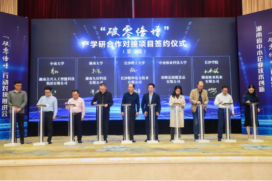 湖南省中小企业技术创新“破零倍增”对接推进会旨在汇聚省内高校院所创新资源,搭建中小企业创新合作平台,共同加大对中小企业创新的支持,推动中小企业成为创新重要发源地。会上,湖南省工信厅总经济师熊琛发布了中小企业200余项技术创新需求,16所高校院所348项战略性新型产业领域前沿性科研成果。我校遴选的“旋转条件下导航测姿一体化接收机”等10项科技成果名列其中。