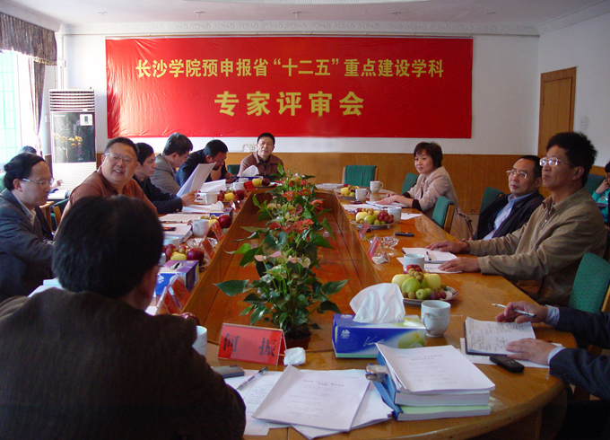 为切实做好省"十二五"重点建设学科的申报工作,11月9日下午,我校聘请校外专家对拟申报的相关学科进行评审。专家评审会在办公楼二会议室召开。湘潭大学副校长黄云清等一行9人组成的专家评审组对我校拟申报省"十二五"重点建设学科的11个学科进行了全面评审。校领导刘耘、郭清泉,各系部主任及相关学科负责人参加了评审会。会议由副院长郭清泉主持。